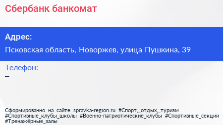 Сбербанк, банкомат по адресу Псковская область, Новоржев, улица Пушкина, 39 в дальнейшем Организация, размещена в следующих категориях: