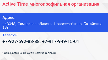 Active Time, многопрофильная организация по адресу 443048, Самарская область, Новосемейкино, Батайская, 18в в дальнейшем Организация, размещена в следующих категориях: