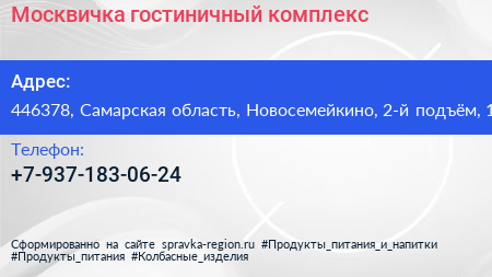 Москвичка, гостиничный комплекс по адресу 446378, Самарская область, Новосемейкино, 2-й подъём, 1 в дальнейшем Организация, размещена в следующих категориях: