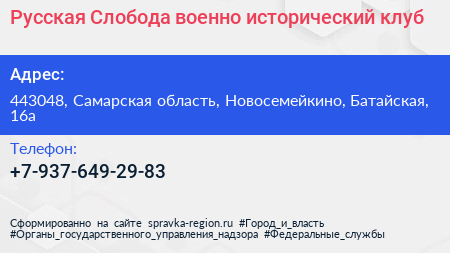 Русская Слобода, военно-исторический клуб по адресу 443048, Самарская область, Новосемейкино, Батайская, 16а в дальнейшем Организация, размещена в следующих категориях: