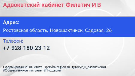 Адвокатский кабинет Филатич И.В. по адресу Ростовская область, Новошахтинск, Садовая, 26 в дальнейшем Организация, размещена в следующих категориях: