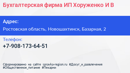 Бухгалтерская фирма, ИП Хоруженко И.В. по адресу Ростовская область, Новошахтинск, Базарная, 2 в дальнейшем Организация, размещена в следующих категориях: