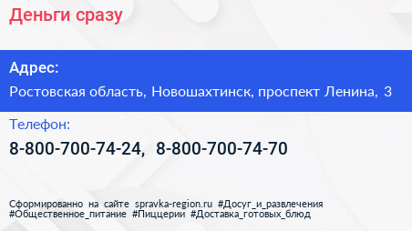 Деньги сразу по адресу Ростовская область, Новошахтинск, проспект Ленина, 3 в дальнейшем Организация, размещена в следующих категориях: