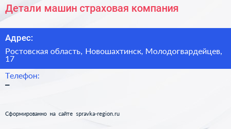 Детали машин, страховая компания по адресу Ростовская область, Новошахтинск, Молодогвардейцев, 17 в дальнейшем Организация, размещена в следующих категориях: