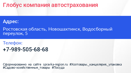 Глобус, компания автострахования по адресу Ростовская область, Новошахтинск, Водосборный переулок, 5 в дальнейшем Организация, размещена в следующих категориях:
