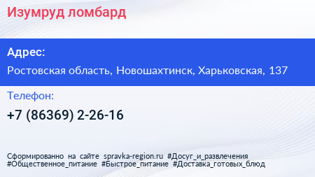Изумруд, ломбард по адресу Ростовская область, Новошахтинск, Харьковская, 137 в дальнейшем Организация, размещена в следующих категориях:
