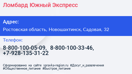 Ломбард Южный Экспресс по адресу Ростовская область, Новошахтинск, Садовая, 32 в дальнейшем Организация, размещена в следующих категориях: