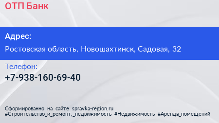 ОТП Банк по адресу Ростовская область, Новошахтинск, Садовая, 32 в дальнейшем Организация, размещена в следующих категориях: