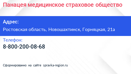 Панацея, медицинское страховое общество по адресу Ростовская область, Новошахтинск, Горняцкая, 21а в дальнейшем Организация, размещена в следующих категориях: