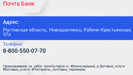 Почта Банк по адресу Ростовская область, Новошахтинск, Рабоче-Крестьянская, 37а в дальнейшем Организация, размещена в следующих категориях: