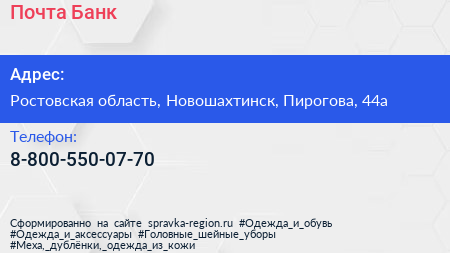Почта Банк по адресу Ростовская область, Новошахтинск, Пирогова, 44а в дальнейшем Организация, размещена в следующих категориях: