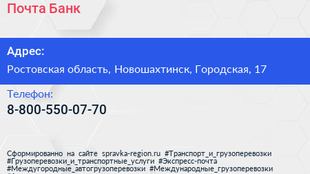 Почта Банк по адресу Ростовская область, Новошахтинск, Городская, 17 в дальнейшем Организация, размещена в следующих категориях: