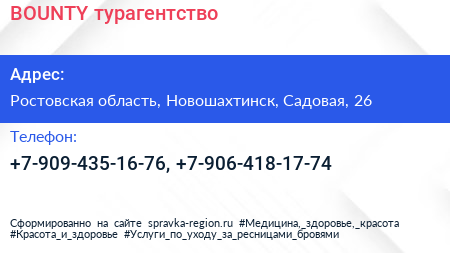 BOUNTY, турагентство по адресу Ростовская область, Новошахтинск, Садовая, 26 в дальнейшем Организация, размещена в следующих категориях: