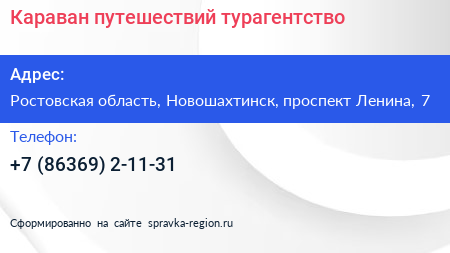 Караван путешествий, турагентство по адресу Ростовская область, Новошахтинск, проспект Ленина, 7 в дальнейшем Организация, размещена в следующих категориях: