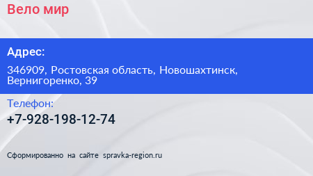 Вело мир по адресу 346909, Ростовская область, Новошахтинск, Вернигоренко, 39 в дальнейшем Организация, размещена в следующих категориях: