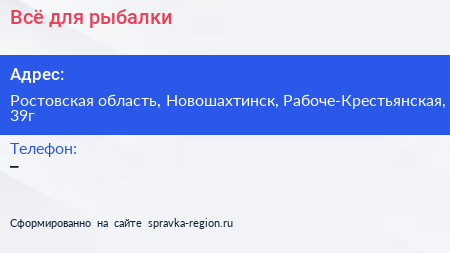 Всё для рыбалки по адресу Ростовская область, Новошахтинск, Рабоче-Крестьянская, 39г в дальнейшем Организация, размещена в следующих категориях: