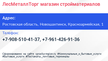 ЛесМеталлТорг, магазин стройматериалов по адресу Ростовская область, Новошахтинск, Красноармейская, 1 в дальнейшем Организация, размещена в следующих категориях:
