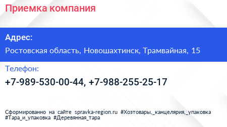 Приемка, компания по адресу Ростовская область, Новошахтинск, Трамвайная, 15 в дальнейшем Организация, размещена в следующих категориях: