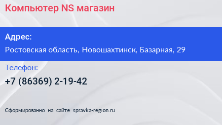 Компьютер NS, магазин по адресу Ростовская область, Новошахтинск, Базарная, 29 в дальнейшем Организация, размещена в следующих категориях: