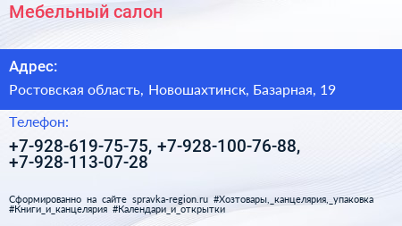 Мебельный салон по адресу Ростовская область, Новошахтинск, Базарная, 19 в дальнейшем Организация, размещена в следующих категориях: