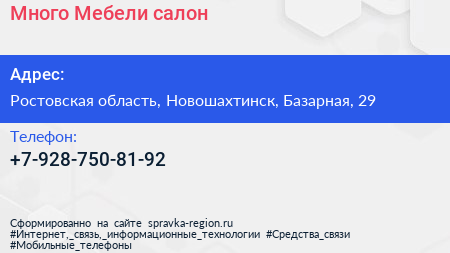 Много Мебели, салон по адресу Ростовская область, Новошахтинск, Базарная, 29 в дальнейшем Организация, размещена в следующих категориях:
