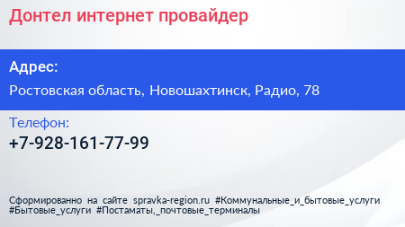 Донтел, интернет-провайдер по адресу Ростовская область, Новошахтинск, Радио, 78 в дальнейшем Организация, размещена в следующих категориях:
