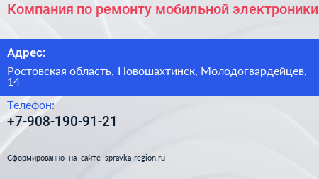 Компания по ремонту мобильной электроники по адресу Ростовская область, Новошахтинск, Молодогвардейцев, 14 в дальнейшем Организация, размещена в следующих категориях: