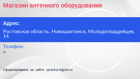 Магазин антенного оборудования по адресу Ростовская область, Новошахтинск, Молодогвардейцев, 14 в дальнейшем Организация, размещена в следующих категориях: