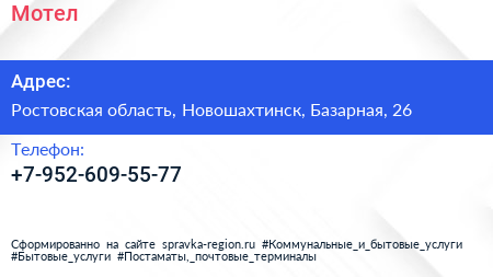 Мотел по адресу Ростовская область, Новошахтинск, Базарная, 26 в дальнейшем Организация, размещена в следующих категориях: