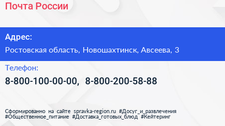 Почта России по адресу Ростовская область, Новошахтинск, Авсеева, 3 в дальнейшем Организация, размещена в следующих категориях: