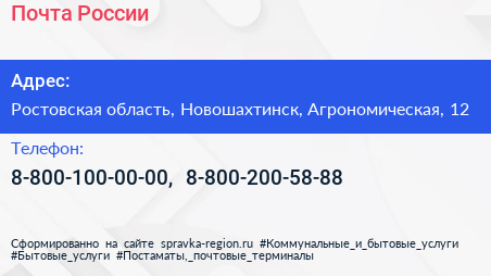 Почта России по адресу Ростовская область, Новошахтинск, Агрономическая, 12 в дальнейшем Организация, размещена в следующих категориях: