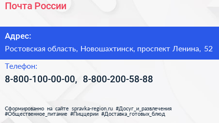 Почта России по адресу Ростовская область, Новошахтинск, проспект Ленина, 52 в дальнейшем Организация, размещена в следующих категориях:
