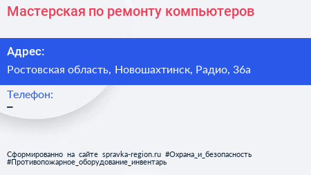 Мастерская по ремонту компьютеров по адресу Ростовская область, Новошахтинск, Радио, 36а в дальнейшем Организация, размещена в следующих категориях:
