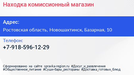 Находка, комиссионный магазин по адресу Ростовская область, Новошахтинск, Базарная, 10 в дальнейшем Организация, размещена в следующих категориях:
