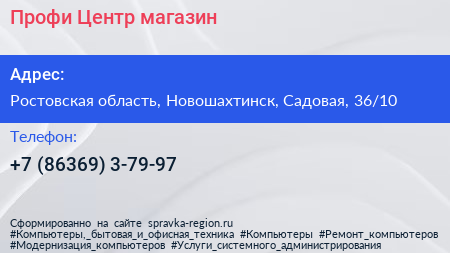 Профи-Центр, магазин по адресу Ростовская область, Новошахтинск, Садовая, 36/10 в дальнейшем Организация, размещена в следующих категориях: