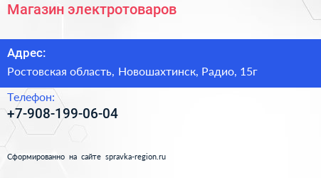 Магазин электротоваров по адресу Ростовская область, Новошахтинск, Радио, 15г в дальнейшем Организация, размещена в следующих категориях: