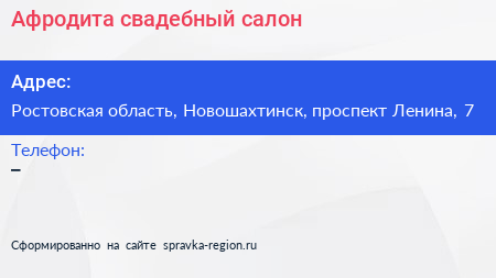 Афродита, свадебный салон по адресу Ростовская область, Новошахтинск, проспект Ленина, 7 в дальнейшем Организация, размещена в следующих категориях: