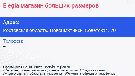 Elegia, магазин больших размеров по адресу Ростовская область, Новошахтинск, Советская, 20 в дальнейшем Организация, размещена в следующих категориях: