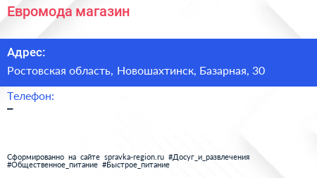 Евромода, магазин по адресу Ростовская область, Новошахтинск, Базарная, 30 в дальнейшем Организация, размещена в следующих категориях: