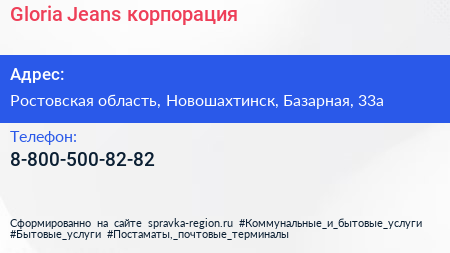 Gloria Jeans, корпорация по адресу Ростовская область, Новошахтинск, Базарная, 33а в дальнейшем Организация, размещена в следующих категориях: