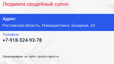 Людмила, свадебный салон по адресу Ростовская область, Новошахтинск, Базарная, 10 в дальнейшем Организация, размещена в следующих категориях: