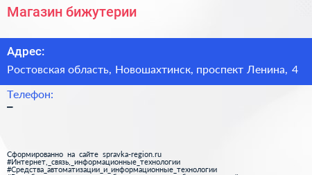 Магазин бижутерии по адресу Ростовская область, Новошахтинск, проспект Ленина, 4 в дальнейшем Организация, размещена в следующих категориях: