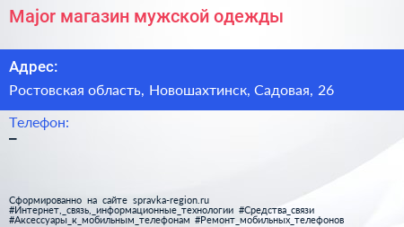 Major, магазин мужской одежды по адресу Ростовская область, Новошахтинск, Садовая, 26 в дальнейшем Организация, размещена в следующих категориях: