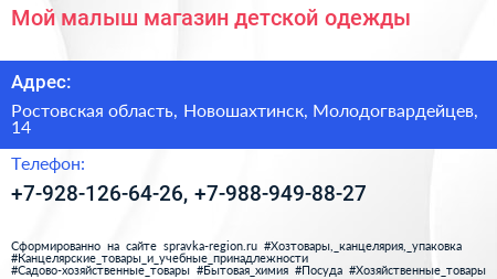 Мой малыш, магазин детской одежды по адресу Ростовская область, Новошахтинск, Молодогвардейцев, 14 в дальнейшем Организация, размещена в следующих категориях: