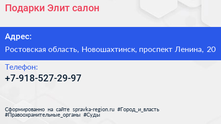 Подарки-Элит, салон по адресу Ростовская область, Новошахтинск, проспект Ленина, 20 в дальнейшем Организация, размещена в следующих категориях: