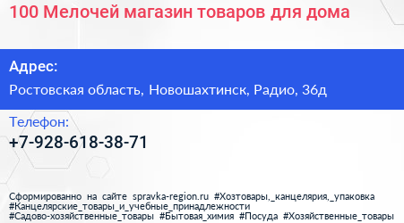 100 Мелочей, магазин товаров для дома по адресу Ростовская область, Новошахтинск, Радио, 36д в дальнейшем Организация, размещена в следующих категориях: