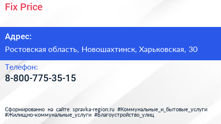 Fix Price по адресу Ростовская область, Новошахтинск, Харьковская, 30 в дальнейшем Организация, размещена в следующих категориях: