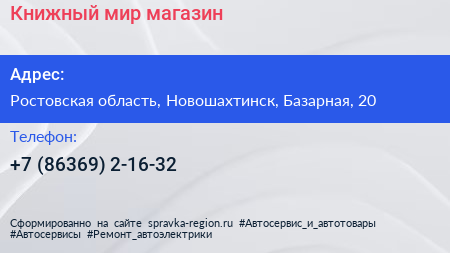 Книжный мир, магазин по адресу Ростовская область, Новошахтинск, Базарная, 20 в дальнейшем Организация, размещена в следующих категориях: