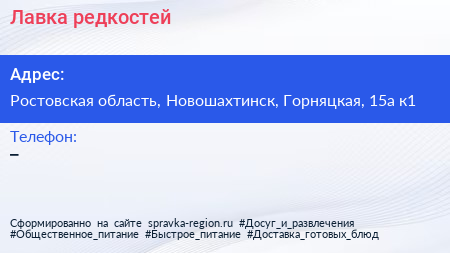 Лавка редкостей по адресу Ростовская область, Новошахтинск, Горняцкая, 15а к1 в дальнейшем Организация, размещена в следующих категориях: