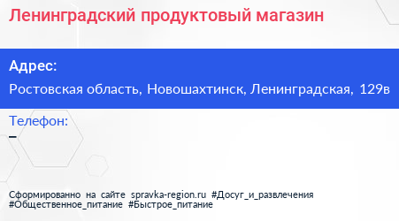 Ленинградский, продуктовый магазин по адресу Ростовская область, Новошахтинск, Ленинградская, 129в в дальнейшем Организация, размещена в следующих категориях: